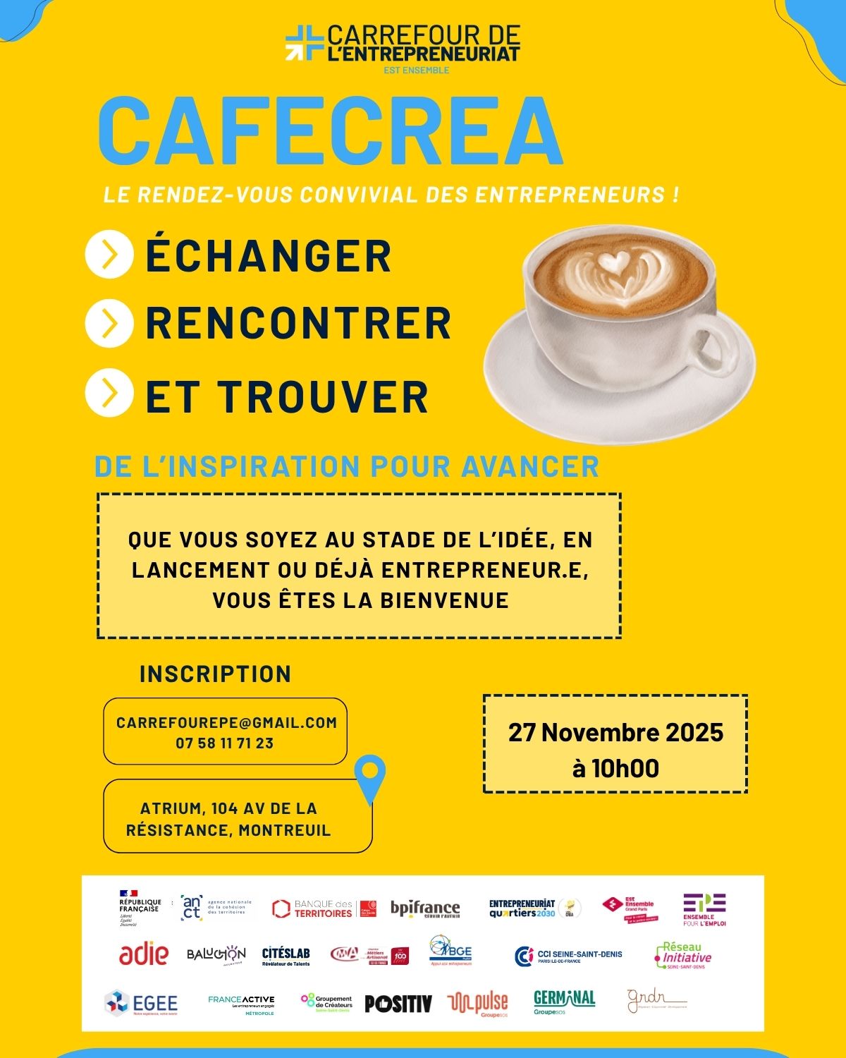 Atrium de Montreuil 104 av Résistance, Montreuil, FranceNetworkingVenez découvrir le temps de réseautage du Carrefour de l’Entrepreneuriat d’Est Ensemble ! Un moment convivial pour échanger, partager vos expériences et créer des connexions utiles entre porteurs de projet 🤝 💡 Que vous soyez au stade d’idée ou déjà lancé·e, c’est le bon endroit pour faire grandir vos ambitions autour d’un café ! 📍 […]
