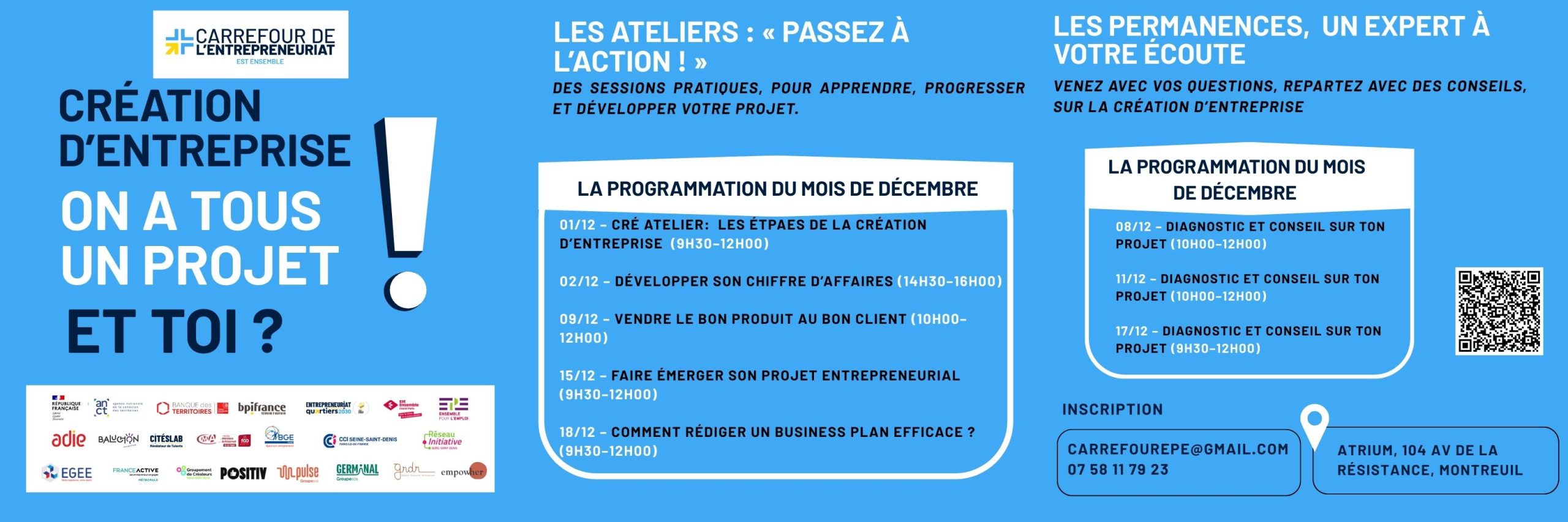 Atrium de Montreuil 104 av Résistance, Montreuil, FranceAtelierPermanences du Carrefour de l’EntrepreneuriatUne question ? Un projet ? Besoin d’un coup de pouce ?Nos permanences sont là pour vous accueillir, vous écouter et vous orienter.Chaque semaine, retrouvez nos partenaires sur place pour un accompagnement personnalisé, sans rendez-vous ou sur inscription.Objectif : vous aider à avancer, quel que soit le stade de votre projet. […]